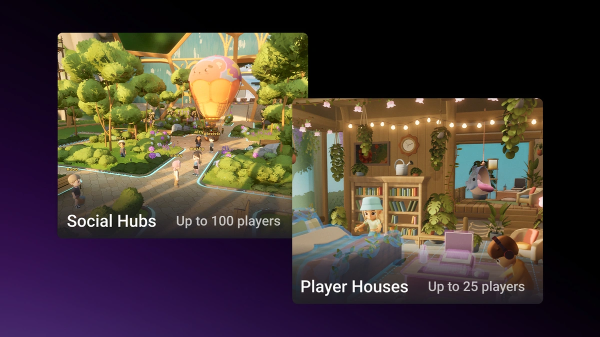 2. 플레이어 하우스(Player Houses): 최대 25명의 플레이어를 지원합니다. 세션 동안 플레이어에게 동적으로 하우스 '슬롯'이 할당되며, 최대 8명의 플레이어 및 친구와 함께 작은 동네에서 집을 공유하는 공용 구역입니다.